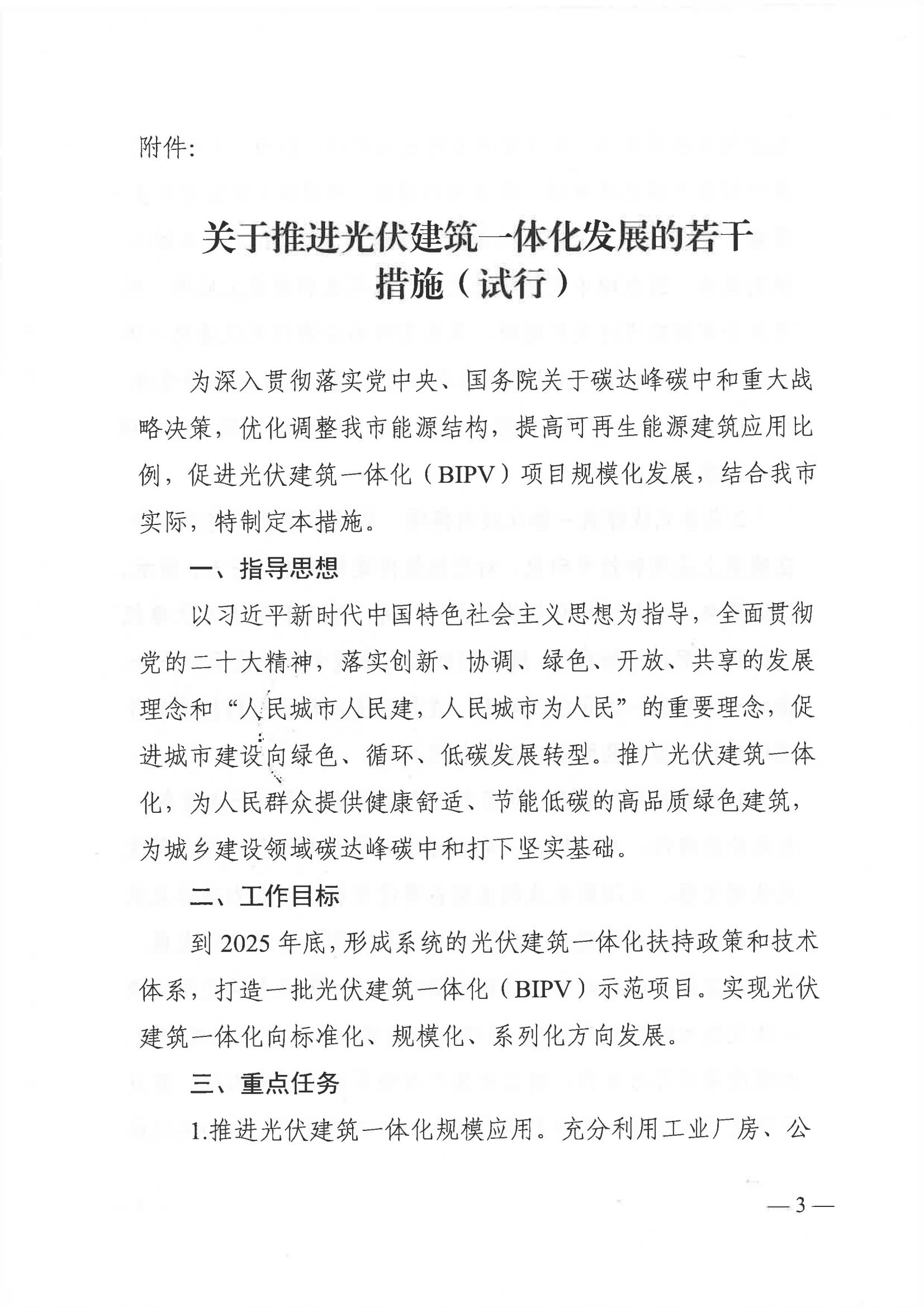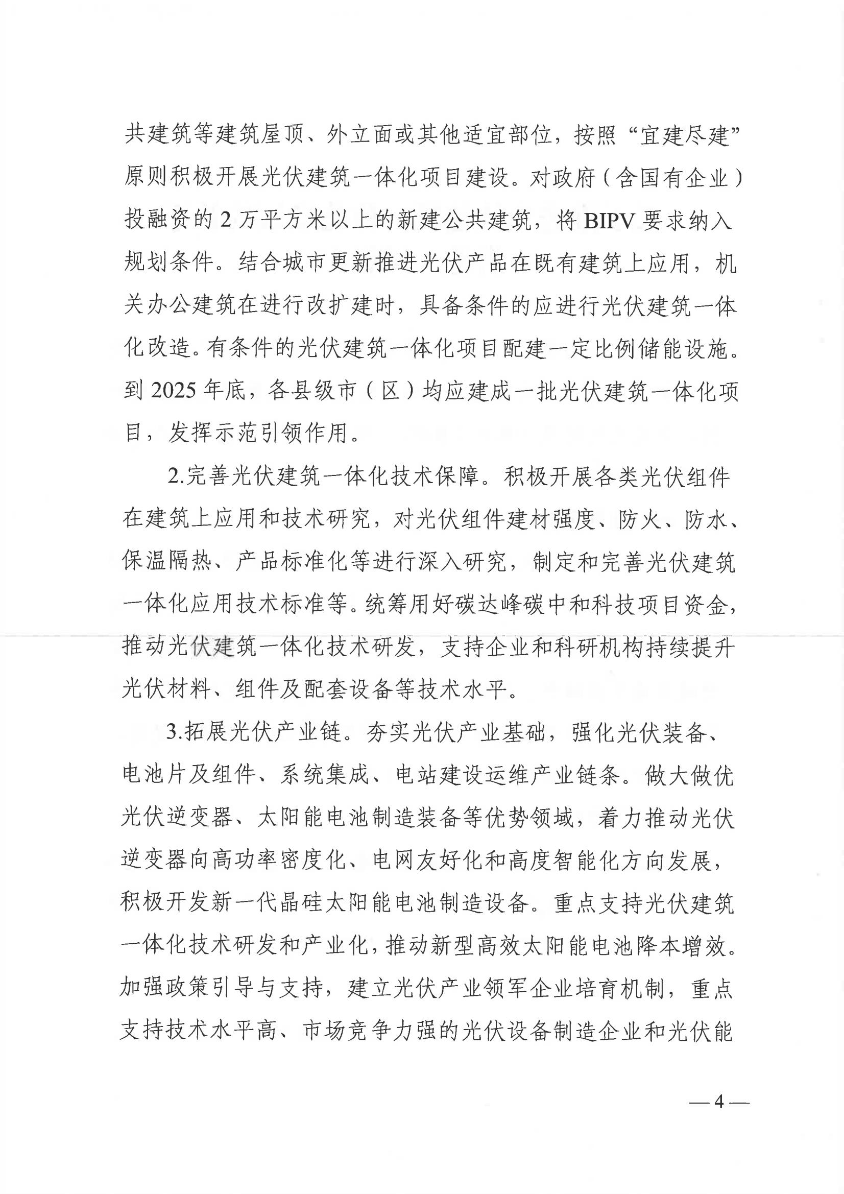 推進(jìn)光伏建筑一體化規模應用。充分利用工業(yè)廠(chǎng)房、公共建筑等建筑屋頂、外立面或其他適宜部位,按照“宜建盡建"原則積極開(kāi)展光伏建筑一體化項目建設。對政府(含國有企業(yè))投融資的2萬(wàn)平方米以上的新建公共建筑,將BIPV要求納入規劃條件。結合城市更新推進(jìn)光伏產(chǎn)品在既有建筑上應用,機關(guān)辦公建筑在進(jìn)行改擴建時(shí),具備條件的應進(jìn)行光伏建筑一體化改造。有條件的光伏建筑一體化項目配建一定比例儲能設施到2025年底,各縣級市(區)均應建成一批光伏建筑一體化項目,發(fā)揮示范引領(lǐng)作用。