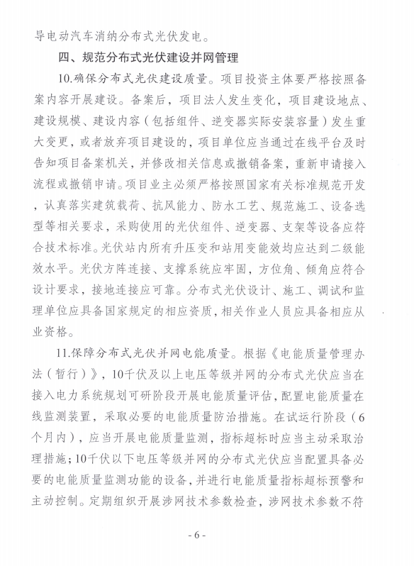 按照“政府引導、市場(chǎng)主導”原則,鼓勵各類(lèi)市場(chǎng)主體公平參與分布式光伏開(kāi)發(fā)建設、運營(yíng)和管理,根據分布式光伏建設空間、負荷水平和電網(wǎng)承載力等資源條件,科學(xué)規劃分布式光伏項目的布局、規模、進(jìn)度以及與充電、儲能等基礎設施的協(xié)調發(fā)展。