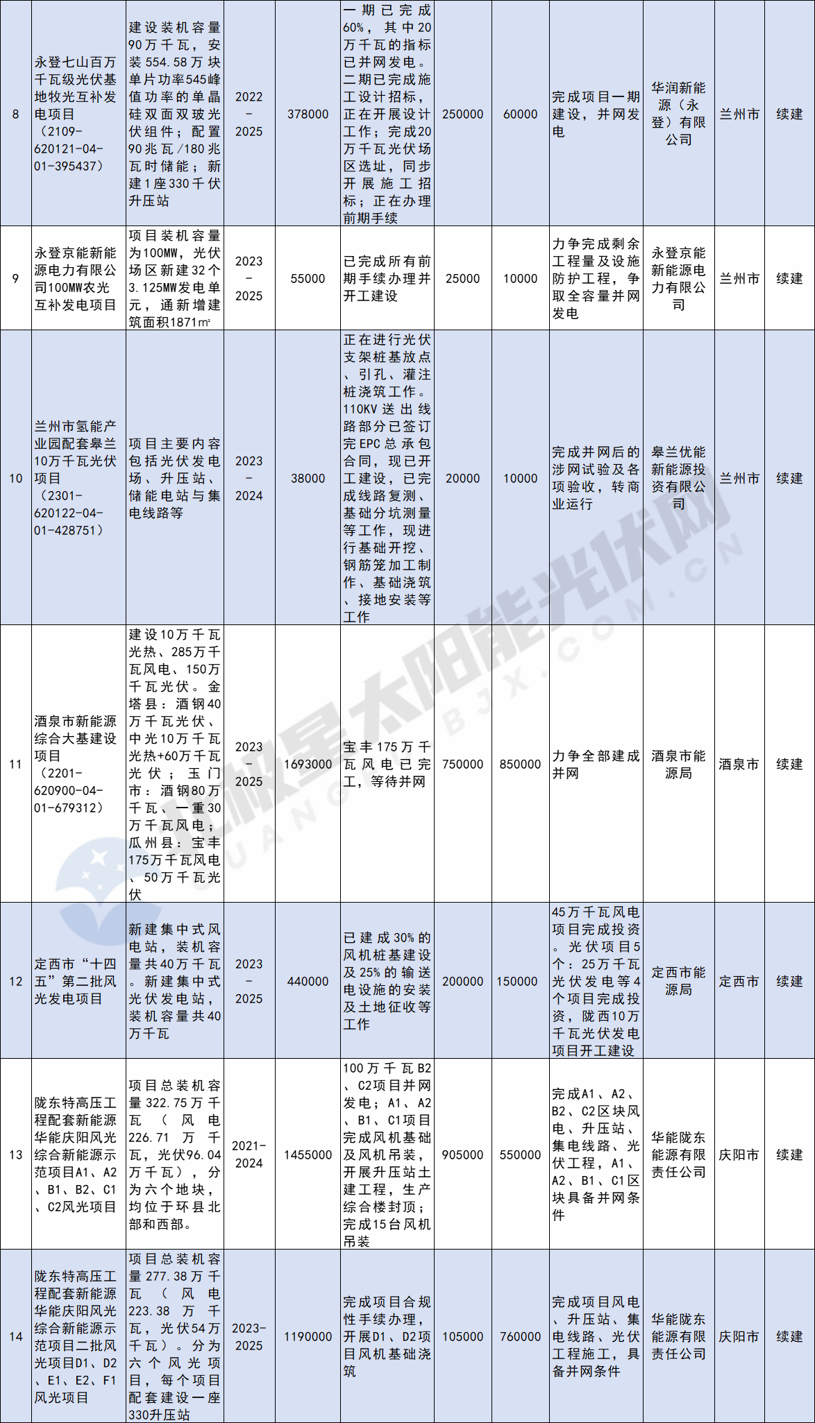 北極星太陽(yáng)能光伏網(wǎng)獲悉,2023年12月22日,甘肅省發(fā)改委發(fā)布關(guān)于征求《甘肅省2024年省列重大建設項目投資計劃(草案)》意見(jiàn)的函,經(jīng)梳理統計,共涉及11個(gè)光伏項目,總投資額達1232.329億元。項目詳情如下: