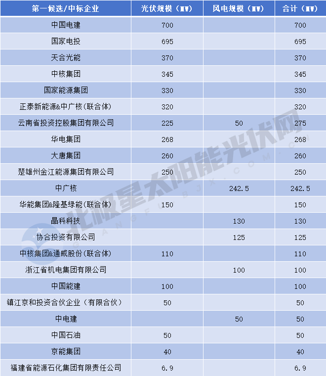 具體到業(yè)主來(lái)看,在已公布項目第一候選/中標企業(yè)中,中國電建中標規模最大,達到700MW;緊隨其后的是國家電投,所獲規模達695MW;天合光能、中核集團、國家能源集團、正泰新能源&中廣核(聯(lián)合體)所獲規模均達320MW及以上。此外,云投集團、華電、大唐、楚雄州金江能源集團有限公司、中廣核、華能集團&隆基綠能(聯(lián)合體)等企業(yè)均有所獲。